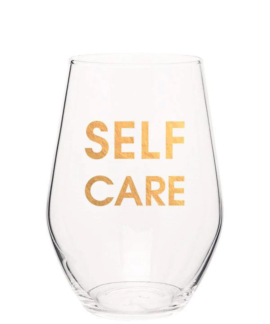 Crush your wine in style with our “Self Care” gold foil stemless wine glass. Wine glasses are printed in Los Angeles.