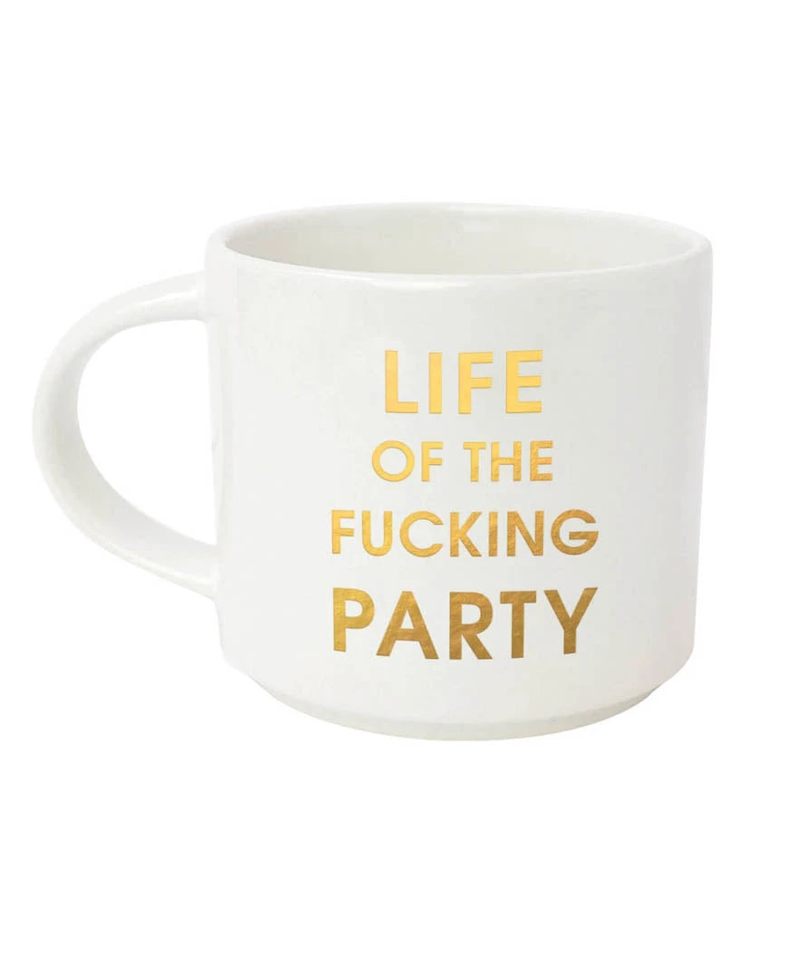 Our “Life of the Fucking Party” coffee mug is real mood. Gold Foil Imprint, Jumbo sized coffee mug.