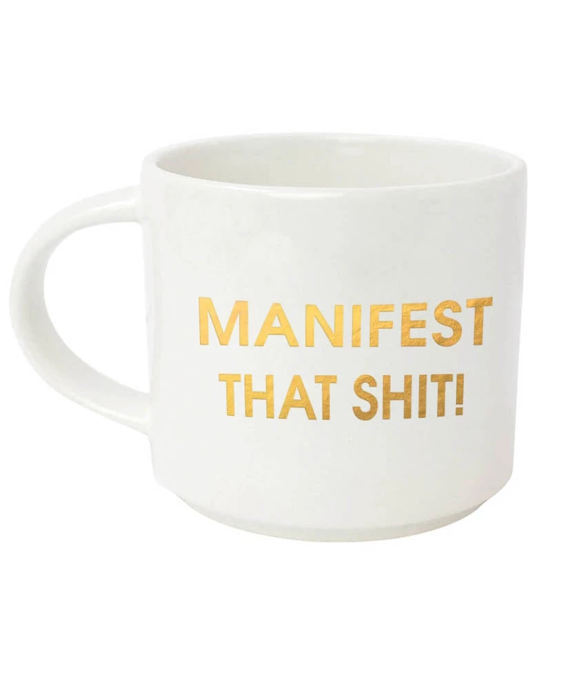 Our “Manifest that Shit” coffee mug is the message that we all need to start the day. Gold Foil Imprint, Jumbo sized coffee mug.