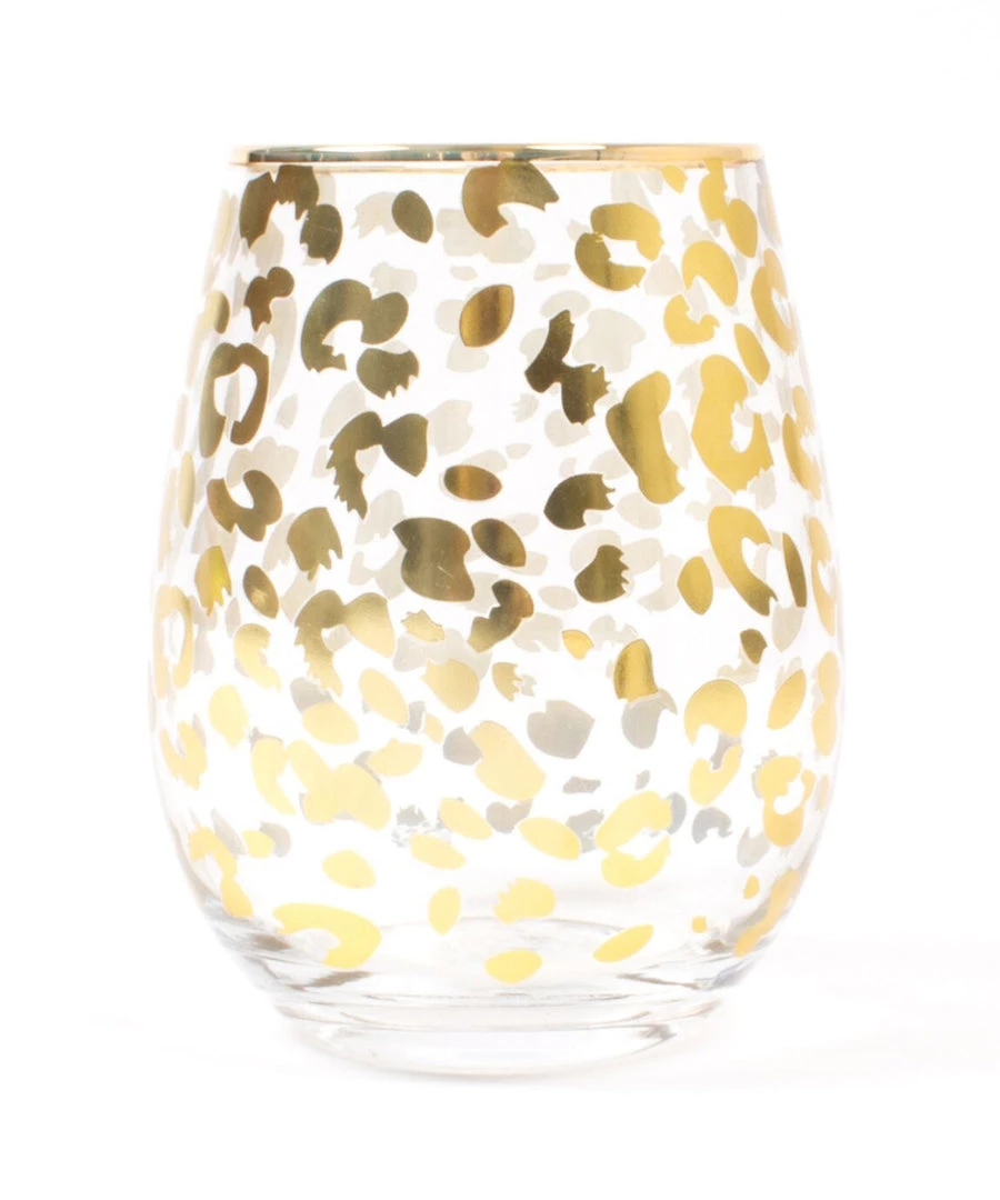 Sip in style in this darling stemless wine glass featuring a gold leopard design.
