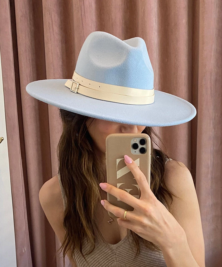 A statement hat for spring and summer. This blue color is simply gorgeous. Accented by an ivory faux lether double band with buckle, this hat is the perfect finishing touch to all of your looks.