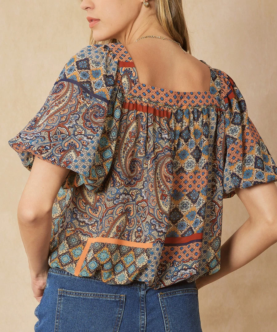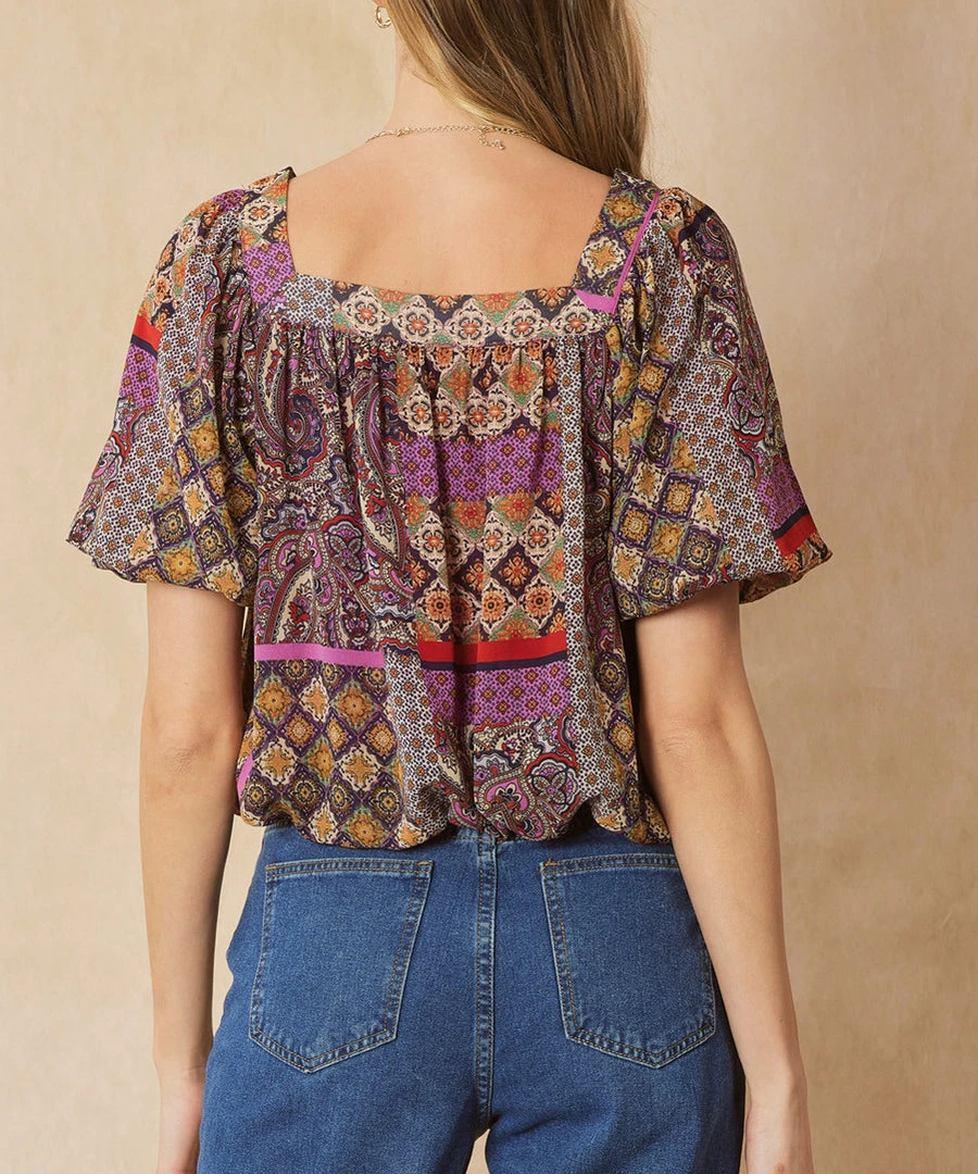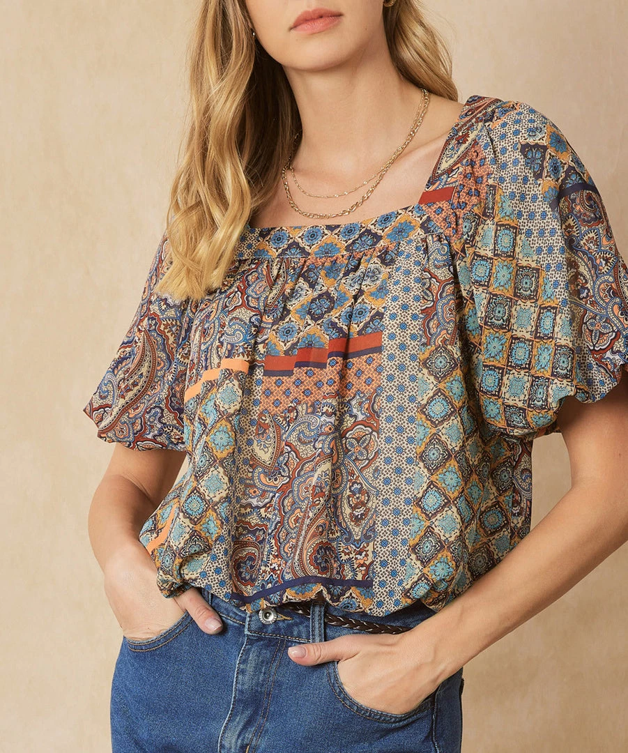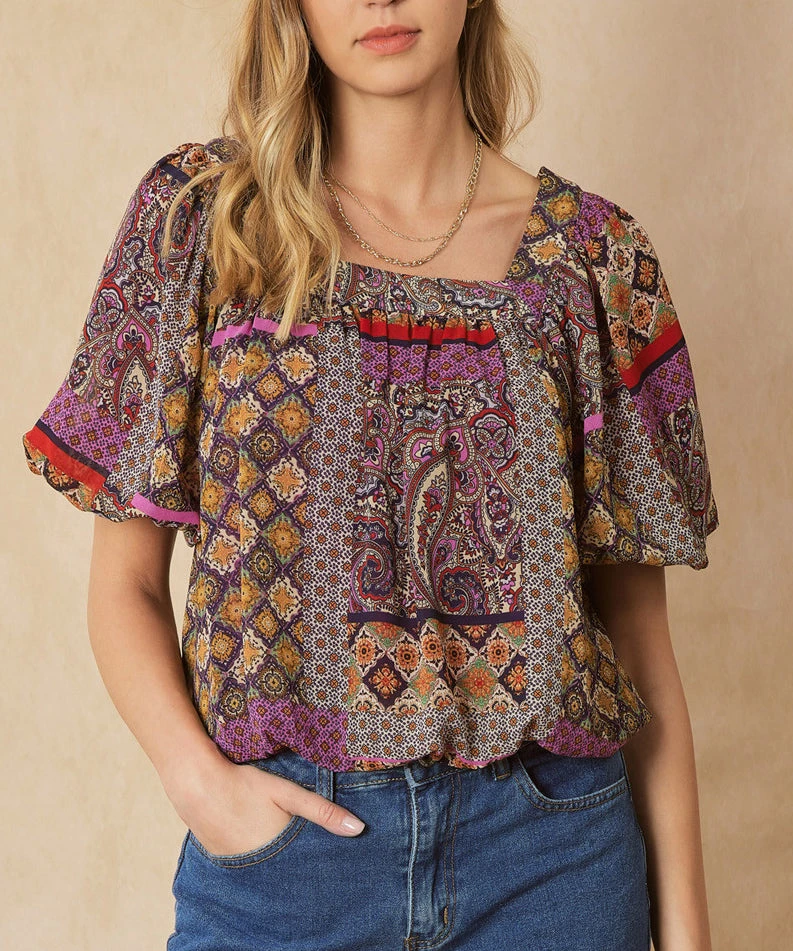 This fun boho print top features a square neckline, puff sleeves and a bubble hem. The perfect transitional top to pair with your favorite pair of shorts or jeans.