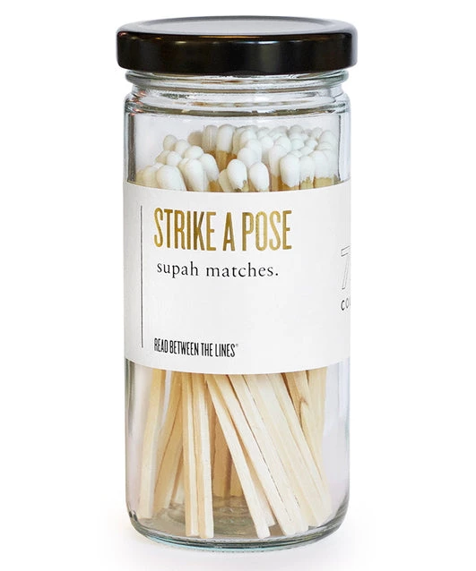 75 wooden safety matches with white tips • 4 inch match length • Clear decorative glass bottle features luxe foil-stamped label • Strike pad on back for easy lighting • Secure, tight-fitting black lid for safety
