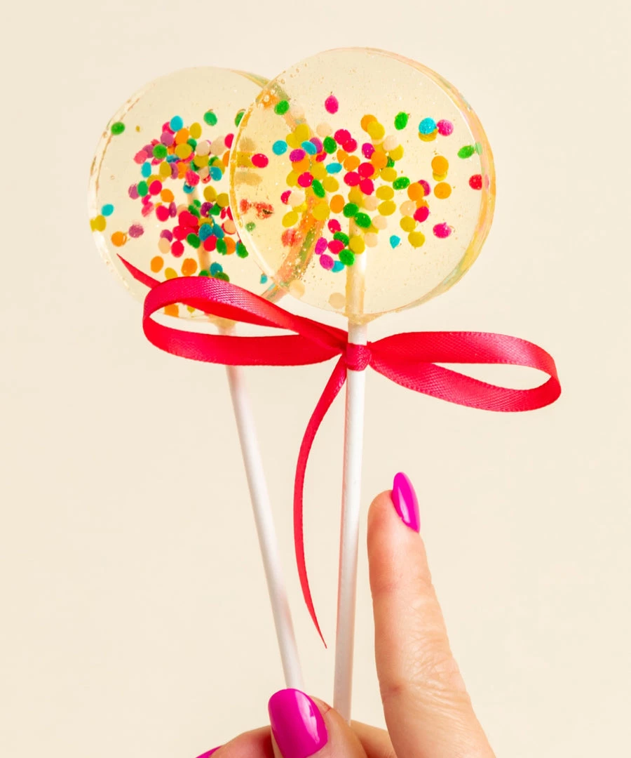 This gorgeous hard candy lollipop is filled with colorful nonpareils and clear edible glitter.