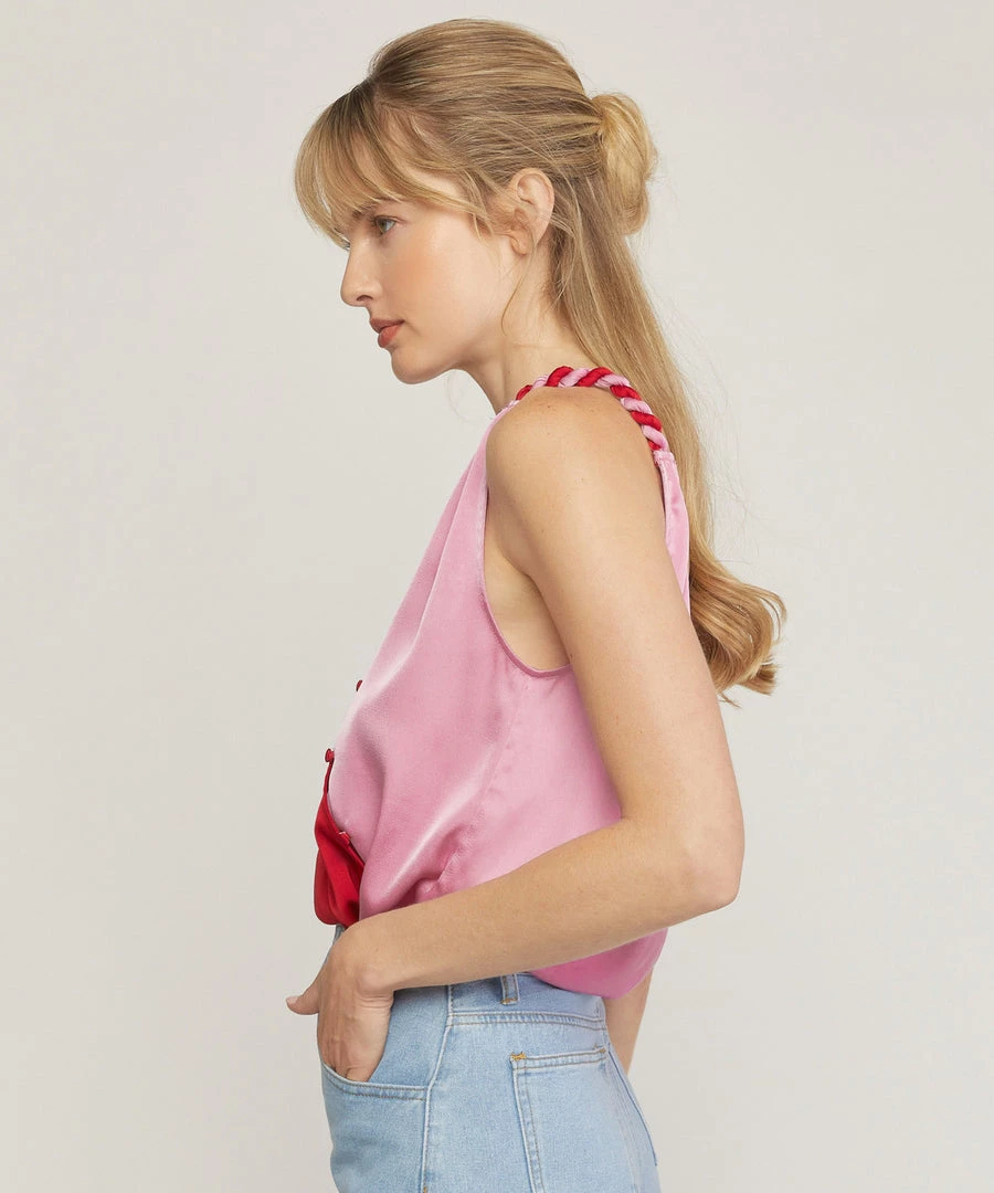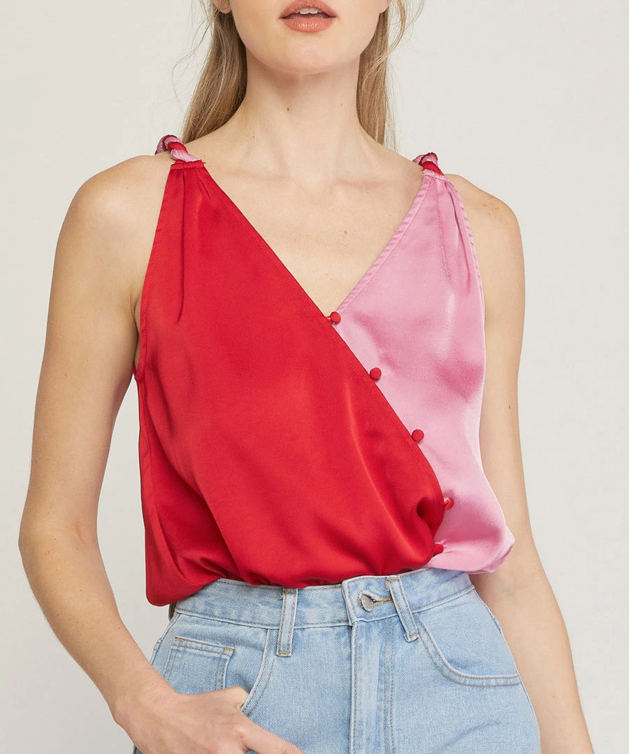 This gorgeous color block surplice bodysuit features button detailing in the front with braided straps. A gorgeous statement top that can be worn layered or alone. This pretty color combo is this must have color palette of the season!