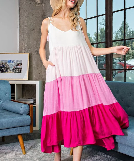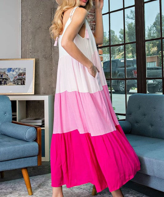 Be colorful and bold with our latest maxi dress. Featuring a tiered body with color block detail and tassel straps. A must for warm weather days!