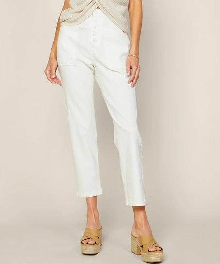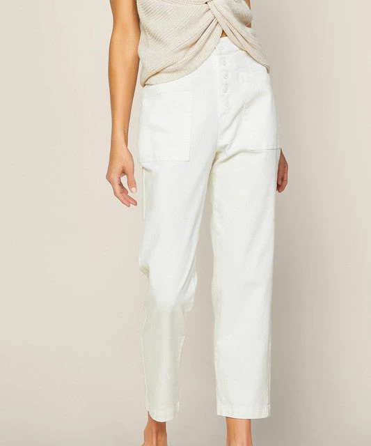 These cropped white pants are a summer staple! Featuring a button up front, pockets at the side and a copped silhouette, these pants are a staple to throw on with everything from tees to blouses.