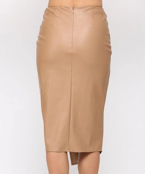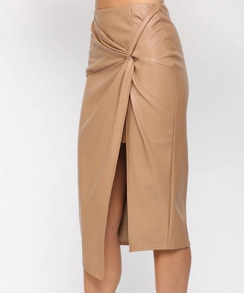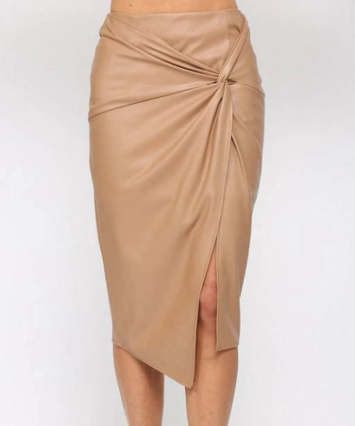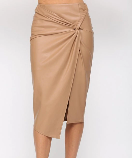 This faux leather midi skirt features a wrap silhouette. A must to dress up or pair with your favorite tee. Fits so well and is so glam!