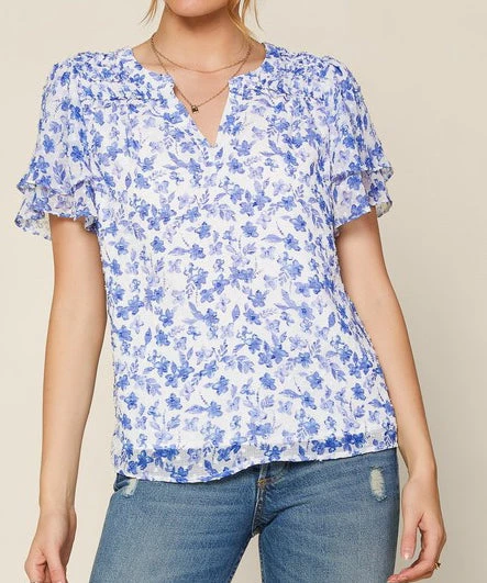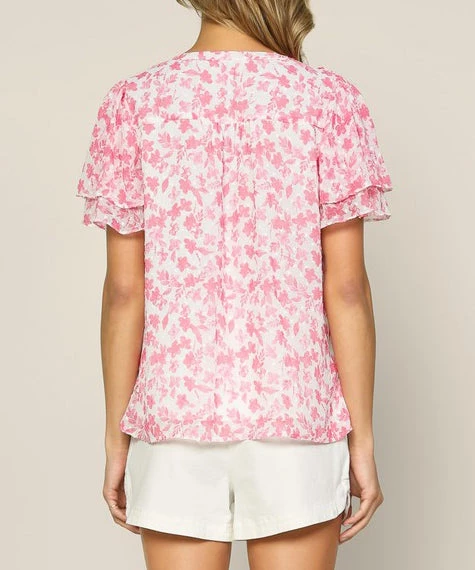 This gorgeous floral print blouse features ruffle detail on the sleeves and a v-neckline. A must for work or play, this blouse is so pretty!