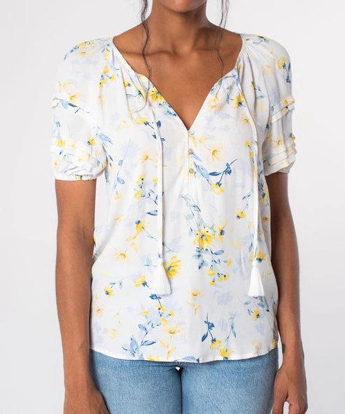 This pretty floral blouse features short volume sleeves with pintuck details and an elastic cuff. Complete with a split neckline with a tassel tie front, this top can be worn for work or play.