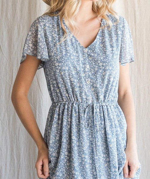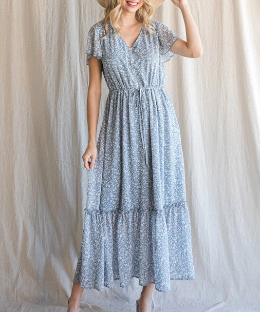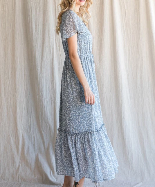This pretty floral maxi dress features a v-neckline, short bell sleeves and a drawstring waistline. Flattering, comfortable and so chic, this dress is a summer must!