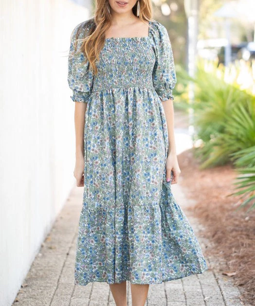 This gorgeous floral print midi dress features smocking detail and puff sleeves. A summer must to wear to your next outing. Perfect for a bridal/baby shower, a day wine tasting or and evening out.