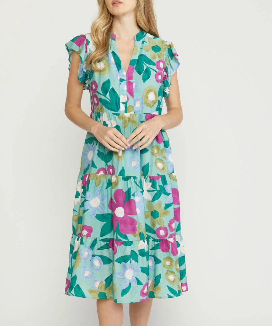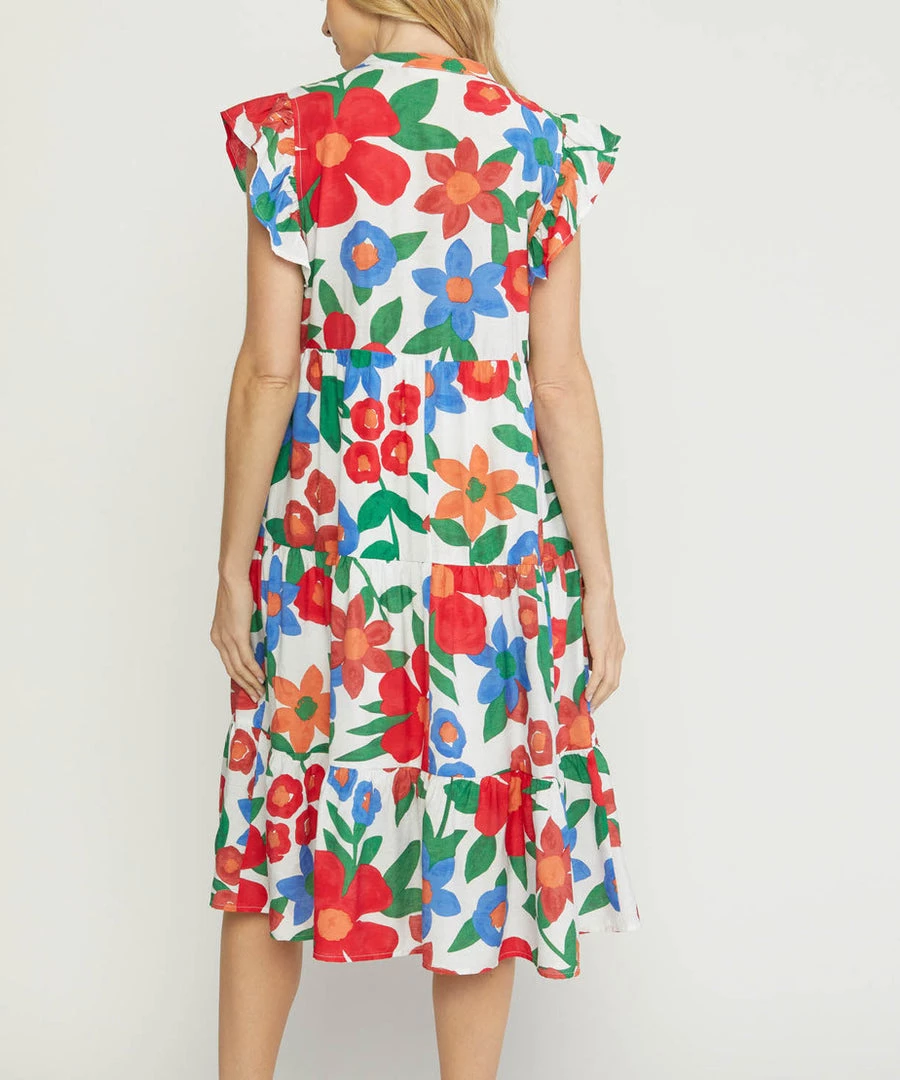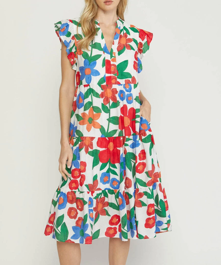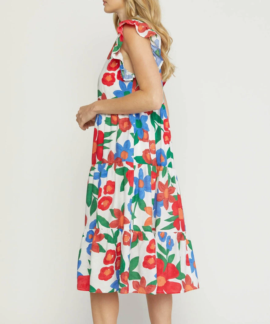 This floral print midi dress features a tiered body and ruffle detail on the sleeves. A comfortable and easy fit, this dress is a summer must to wear day or night.
