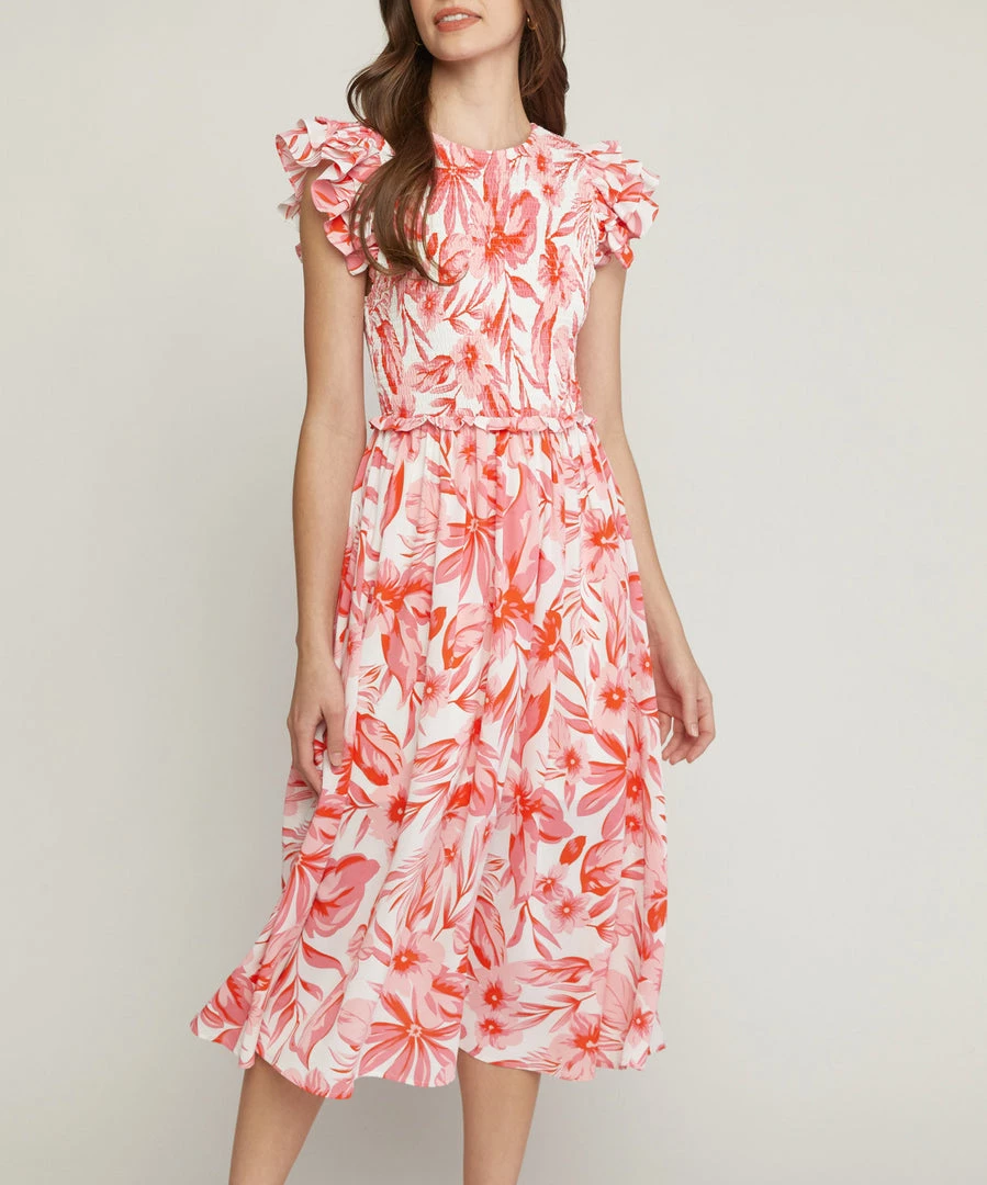 This gorgeous floral print midi dress features a round neckline, short sleeves and a smocked bust w3ith ruffle sleeves. So cute to dress up or down and wear all season long.