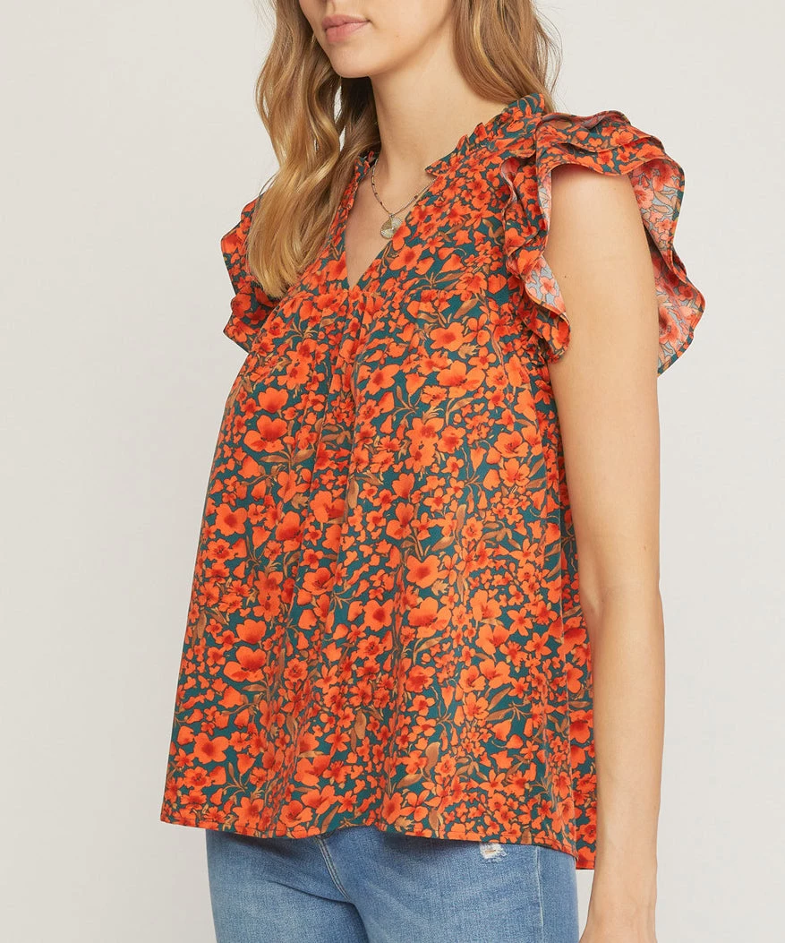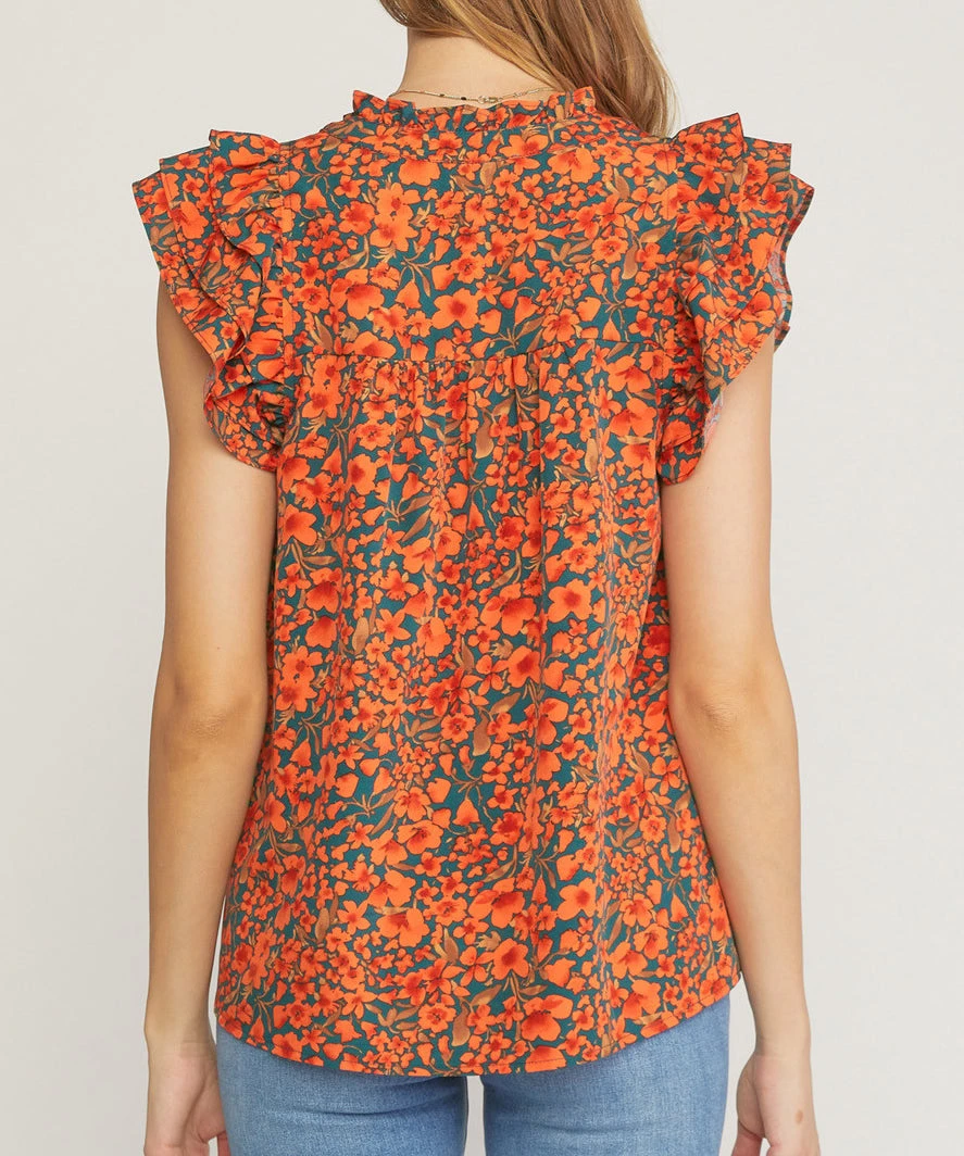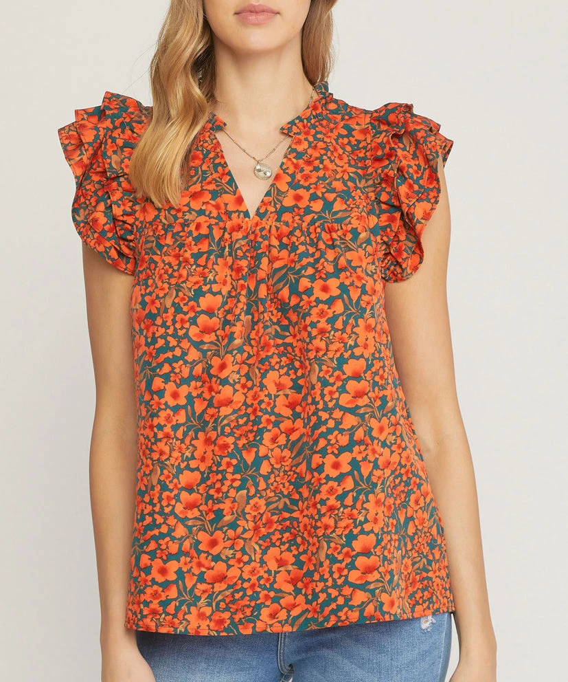 This stand out floral print makes this top come to life! Featuring a v-neckline, ruffle neckline and ruffle sleeves, this top is a must to wear for work or play.