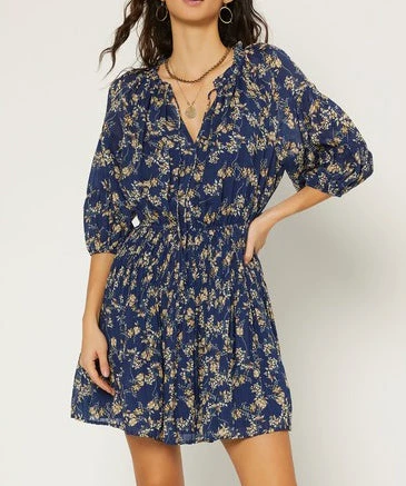 This darling floral print dress features a split neckline, elasticated waist, smocking detail and three-quarter sleeves.