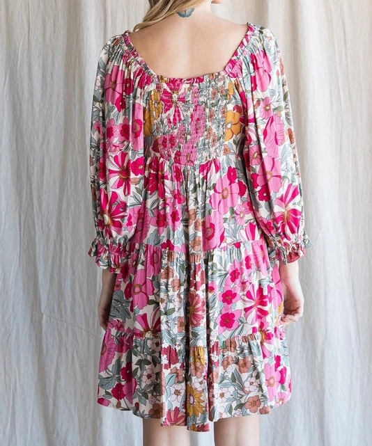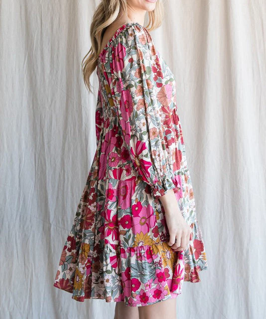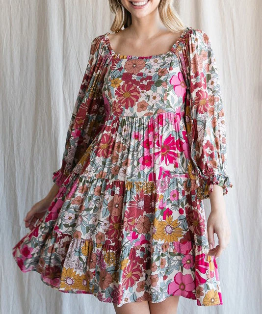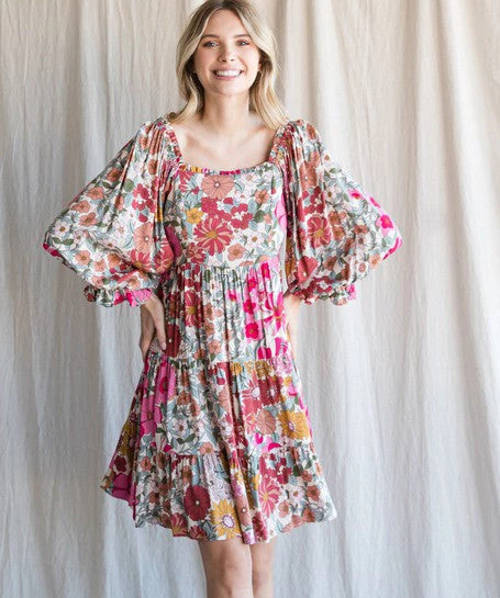 This floral print dress features a square neckline, three quarter bubble sleeves and tiered layers. A summer must to dress up or down.