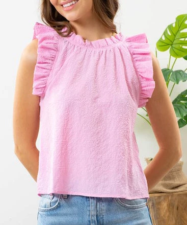 This darling top features flutter sleeves and ruffle detail on the neckline. Soft, comfy and easy to style, this top is a must for spring and summer.