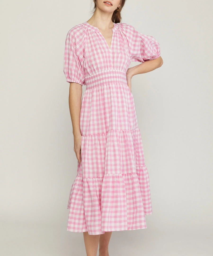 This darling gingham midi dress screams summer! With the cutest pink and white pattern, a v-neckline, bubble sleeves and smocking at the waist, this dress is flattering and so cute!