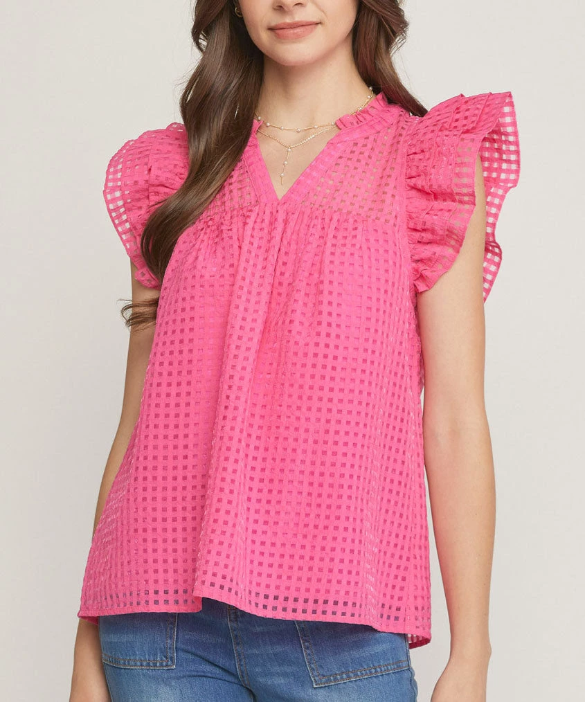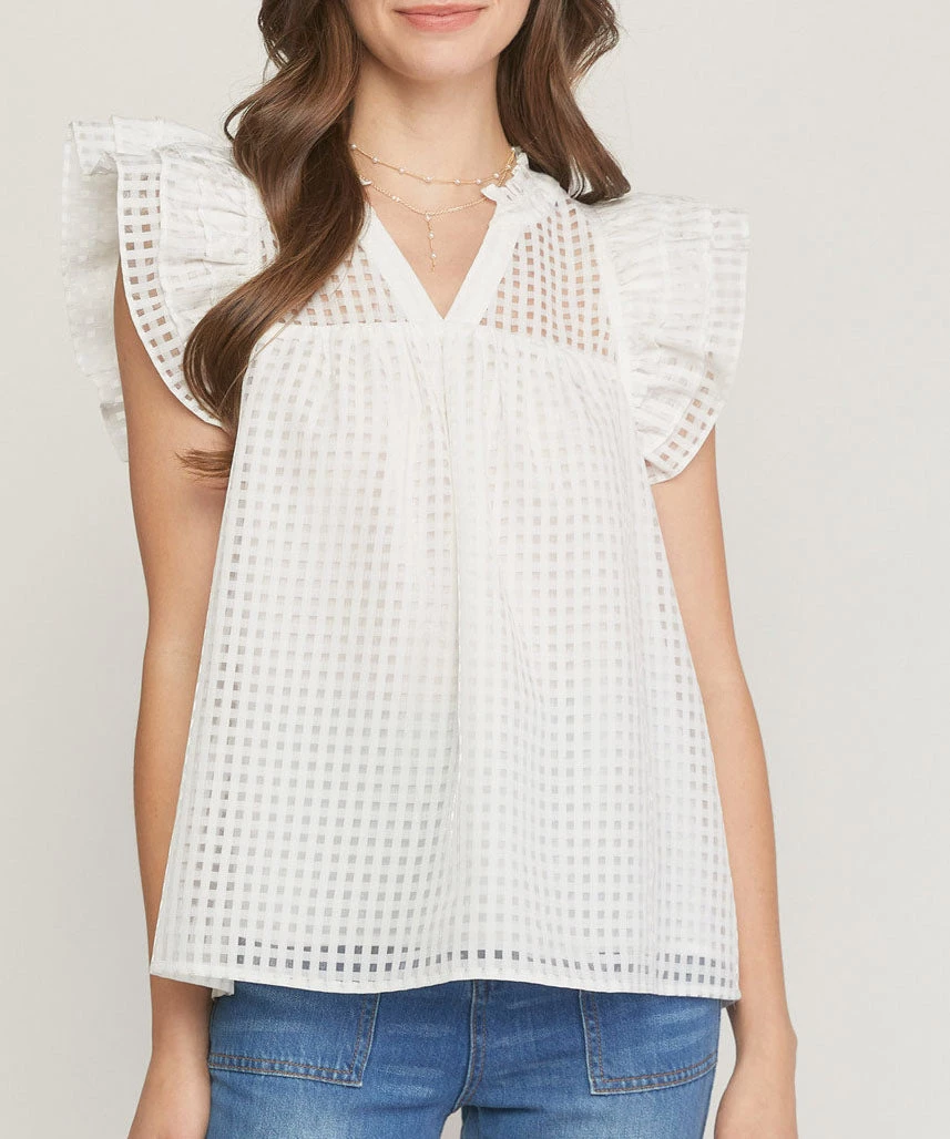 This darling top features a grid print and ruffle detail on the sleeves. An easy top to wear for work or play, this one is polished, on-trend and chic!