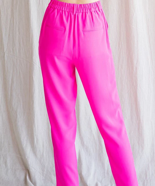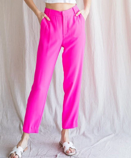 These fun hot pink pants feature a high waist, cropped body and side pockets. A must for wearing all season long. Dress them up or down, this bold color is so much fun!