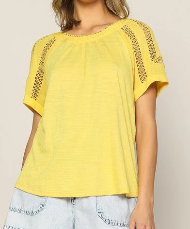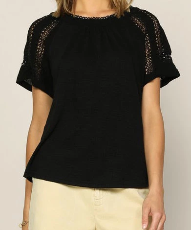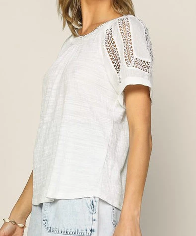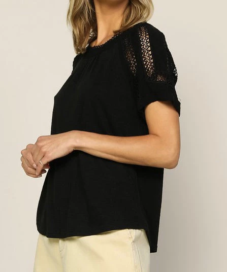 This darling short sleeve top is elevated with lace trim detail. Comfy, cute and easy to style.