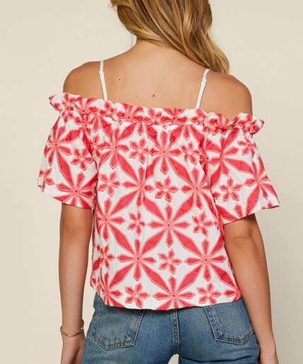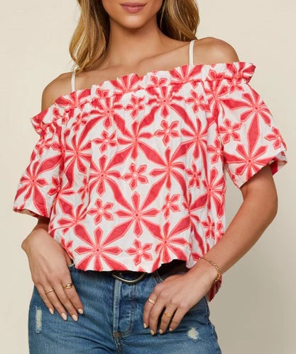 Gorgeous embroidered detail make up this pretty top. Featuring an off the shoulder silhouette, this top is so cute paired with jeans, shorts or a skirt. Perfect with white bottoms to wear all summer long.