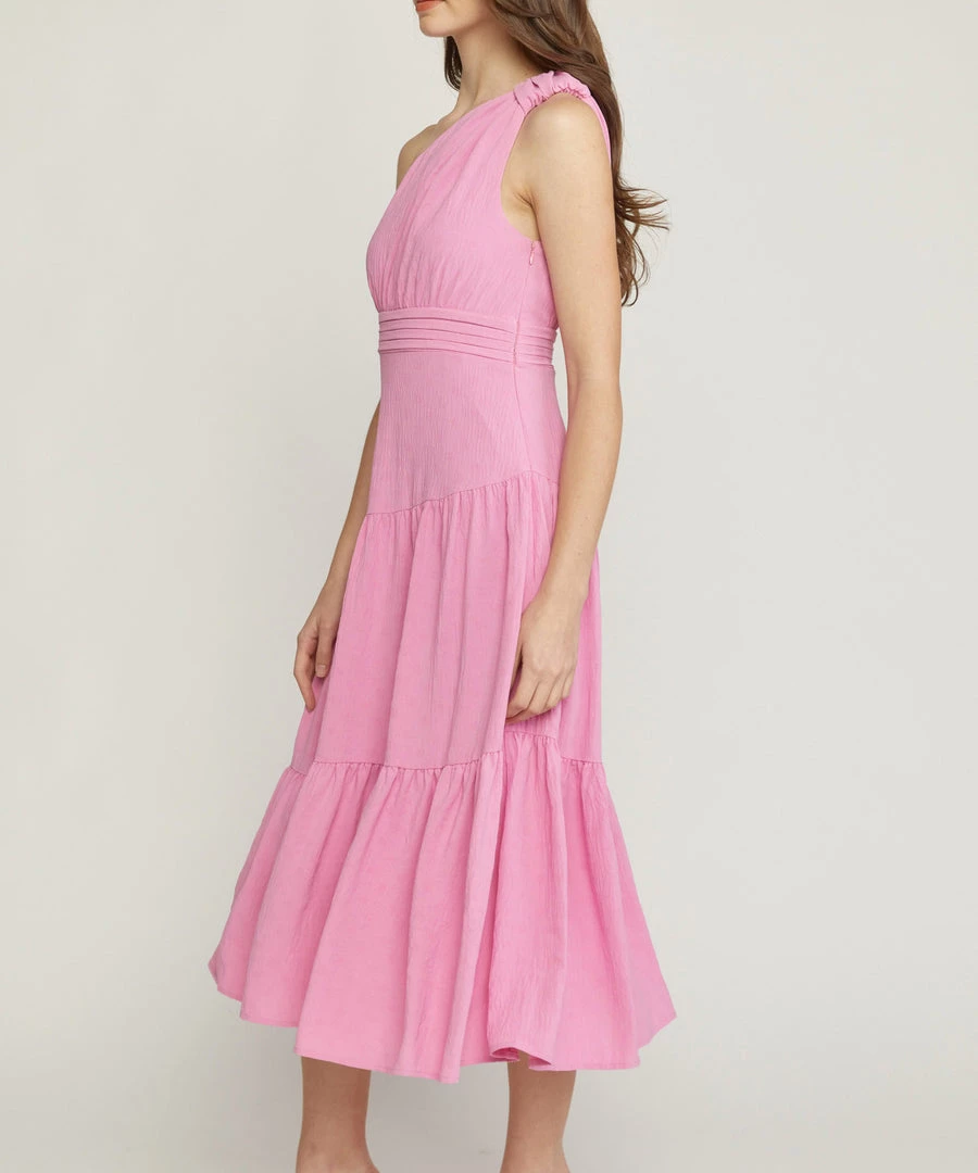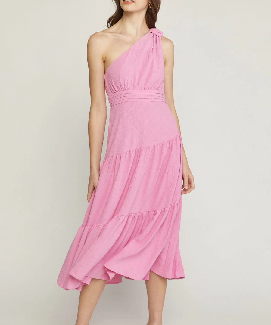 This one shoulder dress features a subtle and tonal polka dot jacquard print, a midi length and pleated detail at the waist. The bubble gum shade is the color of the season and can be dressed up or down.