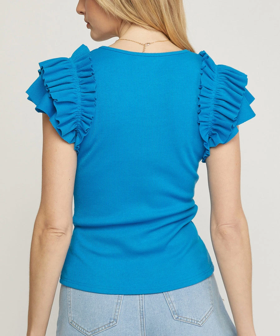 This ribbed top features a scoop neckline, short sleeves and ruffle detailing at the sleeves. A casul top elevated with lots of style, this can be worn casually or dressed up with a skirt.