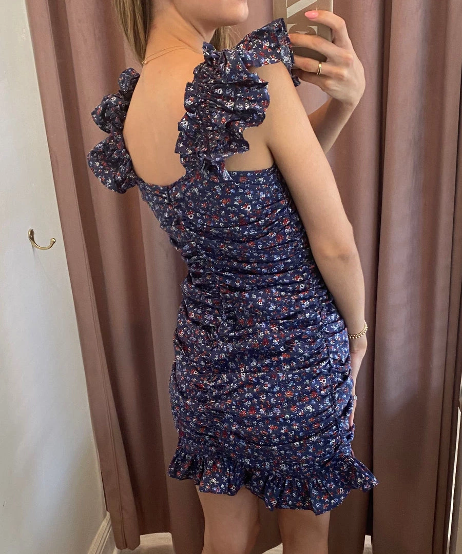 This ruched dress features an all over floral print fabric, ruffled sleeves and hem, buttons down the front, and a back zipper closure. This dress is so flirty and fun – a must have for summer.