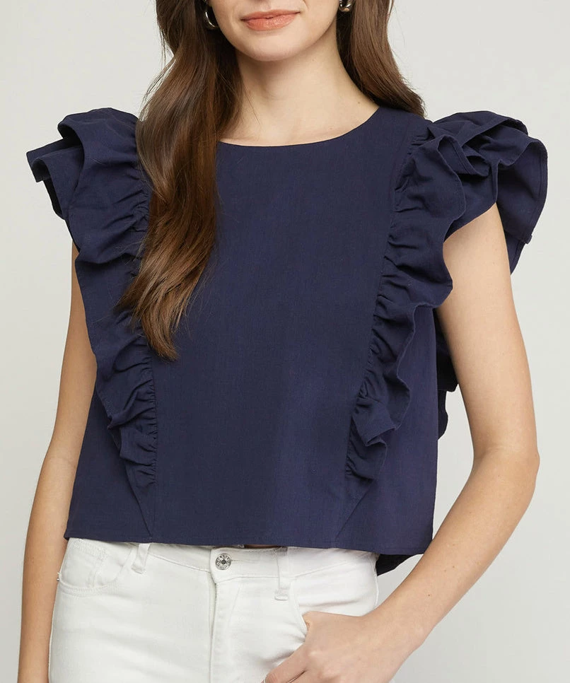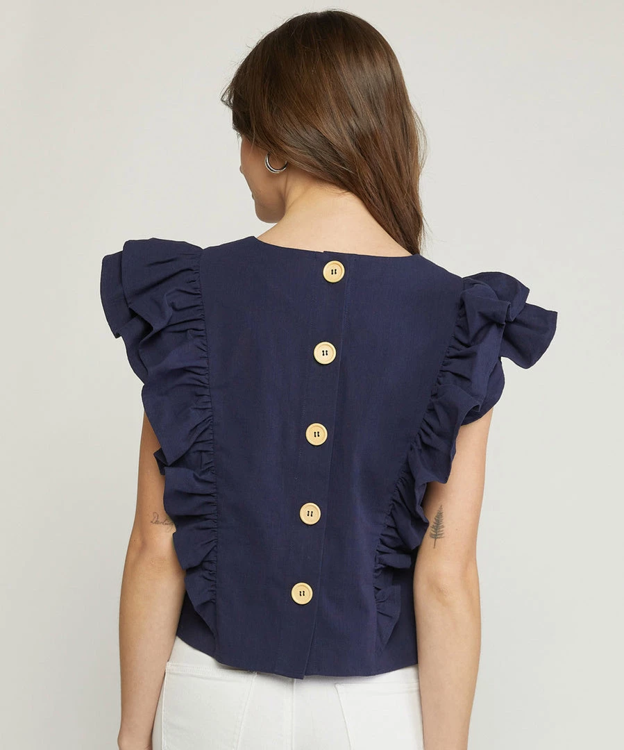 This fun top features a round neckline with ruffle sleeve detail and button detail at the back. On trend and easy to style, this top adds glam to any look.