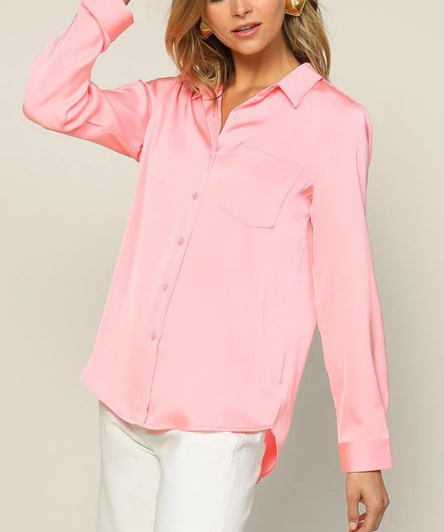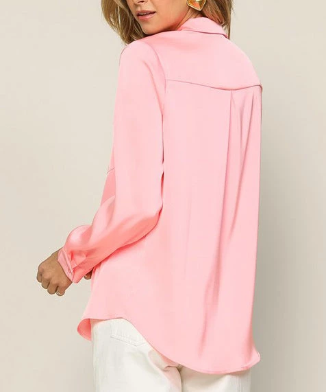 A classic button down shirt updated in a gorgeous satin like material. On trend, pretty and is easy to style for work or play. A wardrobe staple!