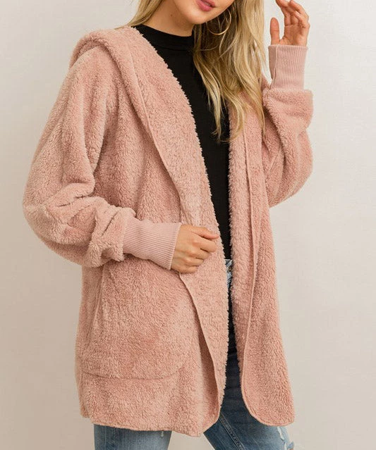 This super soft jacket is a must to wear all the time! With an open front, pockets and a hood, this one is great to throw on over lounge wear or regular wear. Feels like a blanket – so cozy!