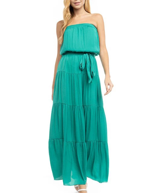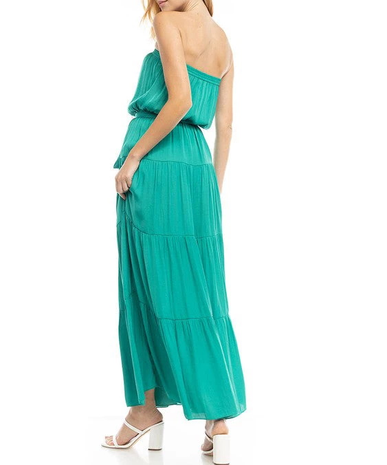 This gorgeous emerald shade pops on this beautiful maxi dress. Featuring a strapless silhouette, this dress can be worn casually or dressy.