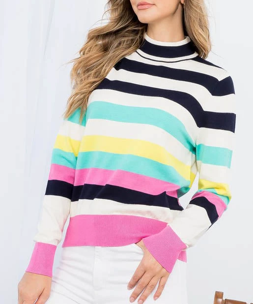 This multi-color turtleneck top is perfect for transitioning to spring. Featuring pops of color and a lightweight feel, this is a must to throw on for work or play.