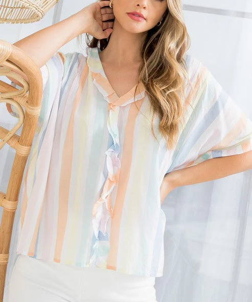 This pretty striped blouse features a relaxed fit, a v-neckline and ruffle detail down the front. The perfect warm weather top to wear for work or play. Perfect with jeans, white bottoms, shorts or a skirt.