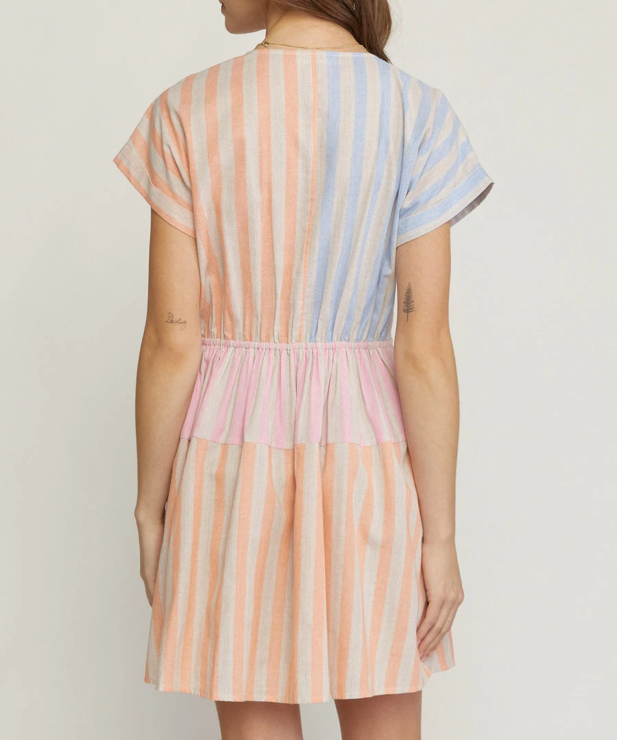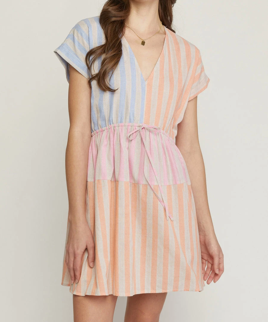 An easy summer dress featuring a striped pattern and a v-neckline. Casual chic and easy to style, this dress is a warm weather must.