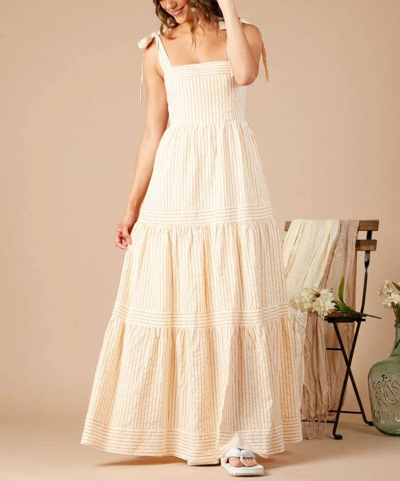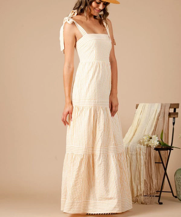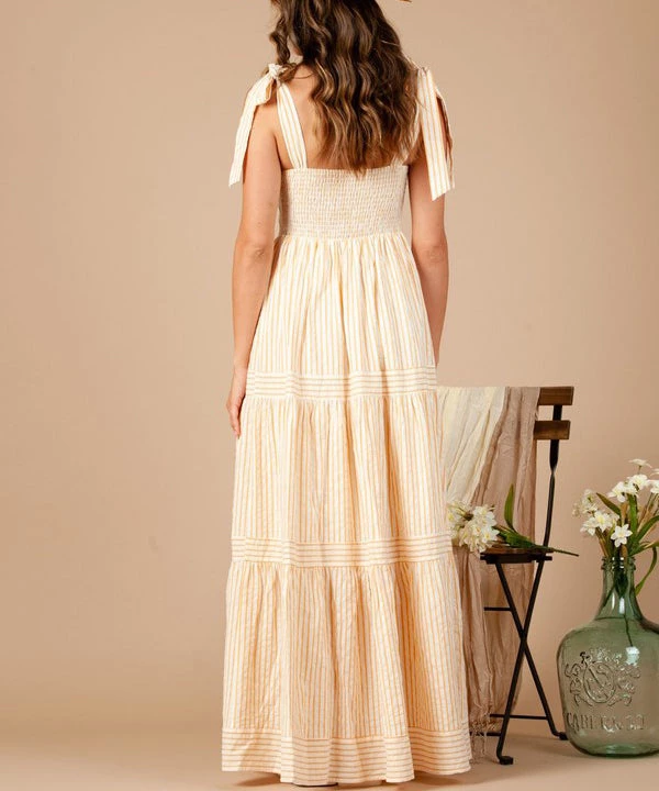 This gorgeous striped maxi dress features a flattering fit, smocked back, strap ties to adjust and yarn dye woven fabric for a natural feel. A must to dress up or down.