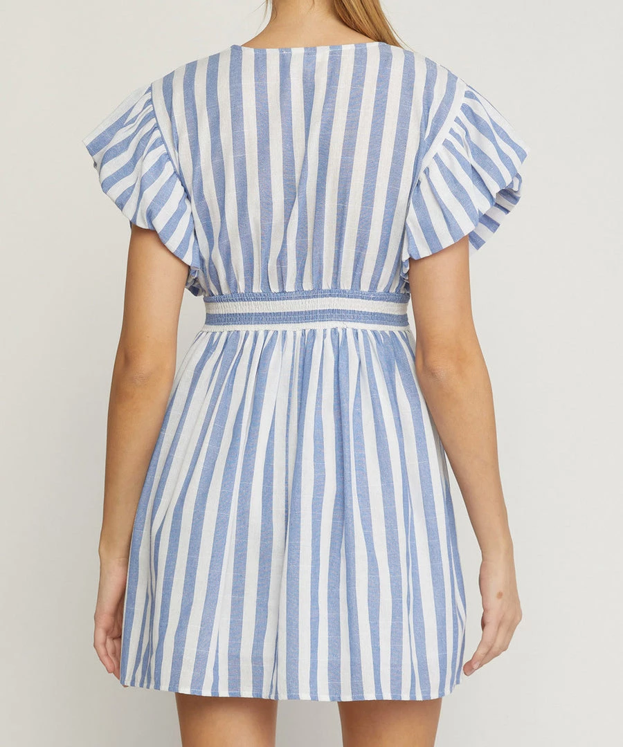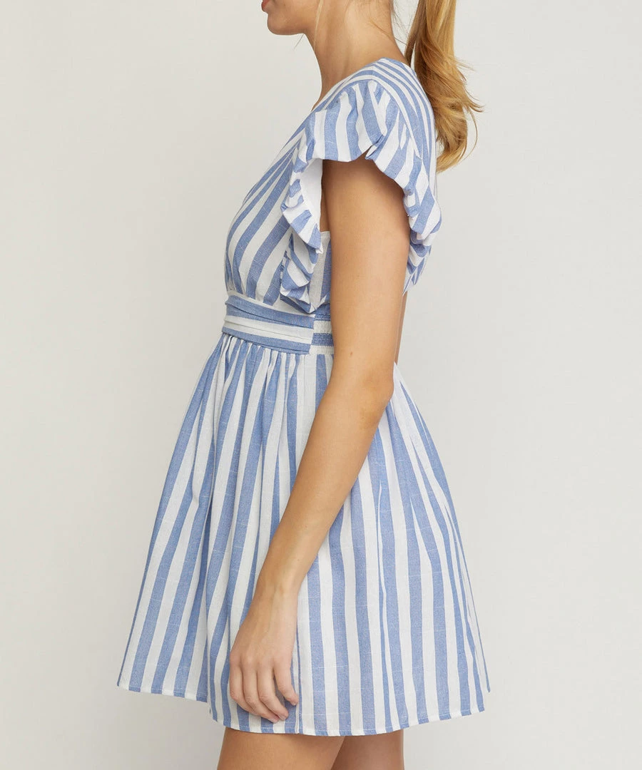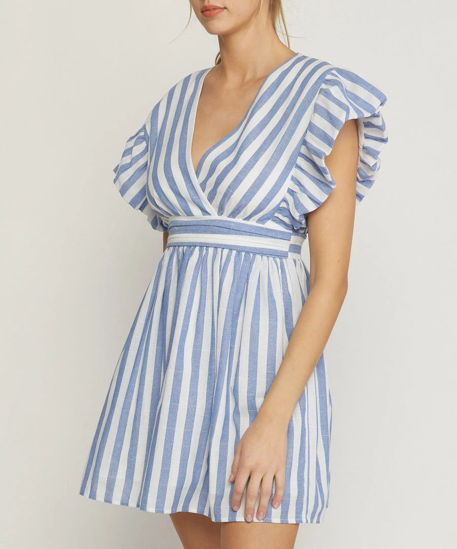 This striped v-neck dress features folded ruffle sleeves and pockets at the sides. Lightweight, cute and comfy, this dress is perfect for summer days.