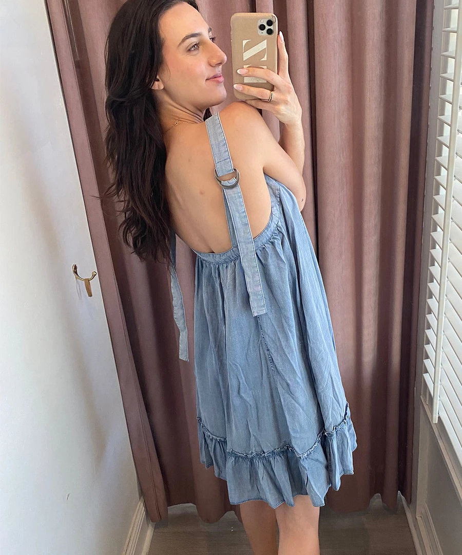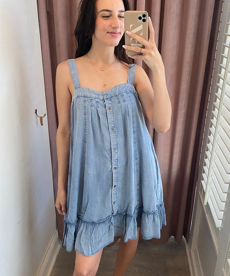 The perfect denim dress that is so soft and comfy. A must for casual summer days, this dress features a button down front and a ruffled hem.