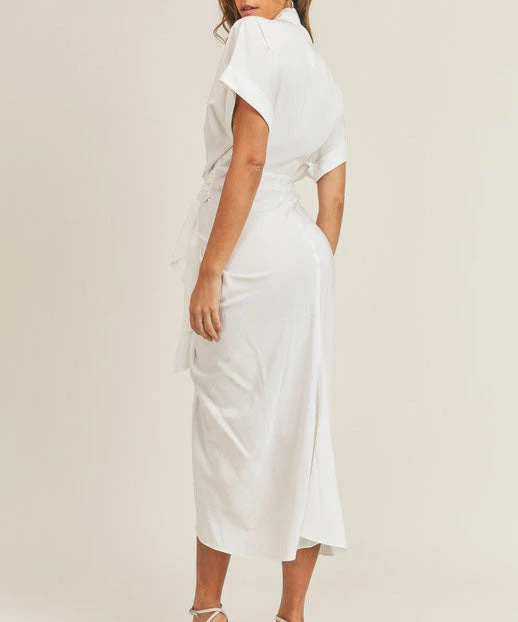 This stand out dress features short sleeves and front tie detailing. A classic midi length keeps this dress a must for work or play. The tencel fabric is soft and comfortable. So chic!
