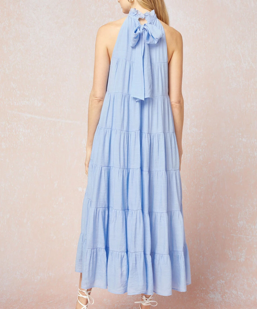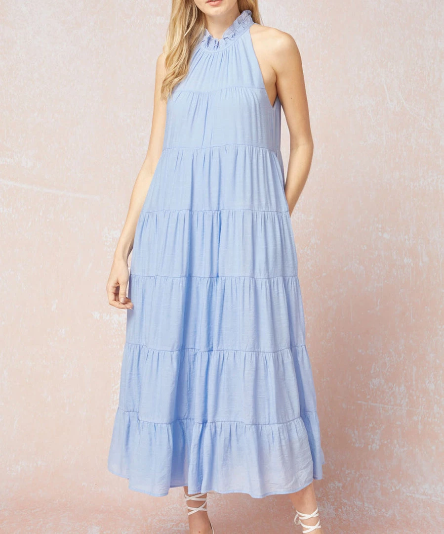 This gorgeous tiered dress features a mock neckline, tiered body, pockets at the sides, and a self tie closure at the back. The blue shade is a must for summer. Easily dress up or down.