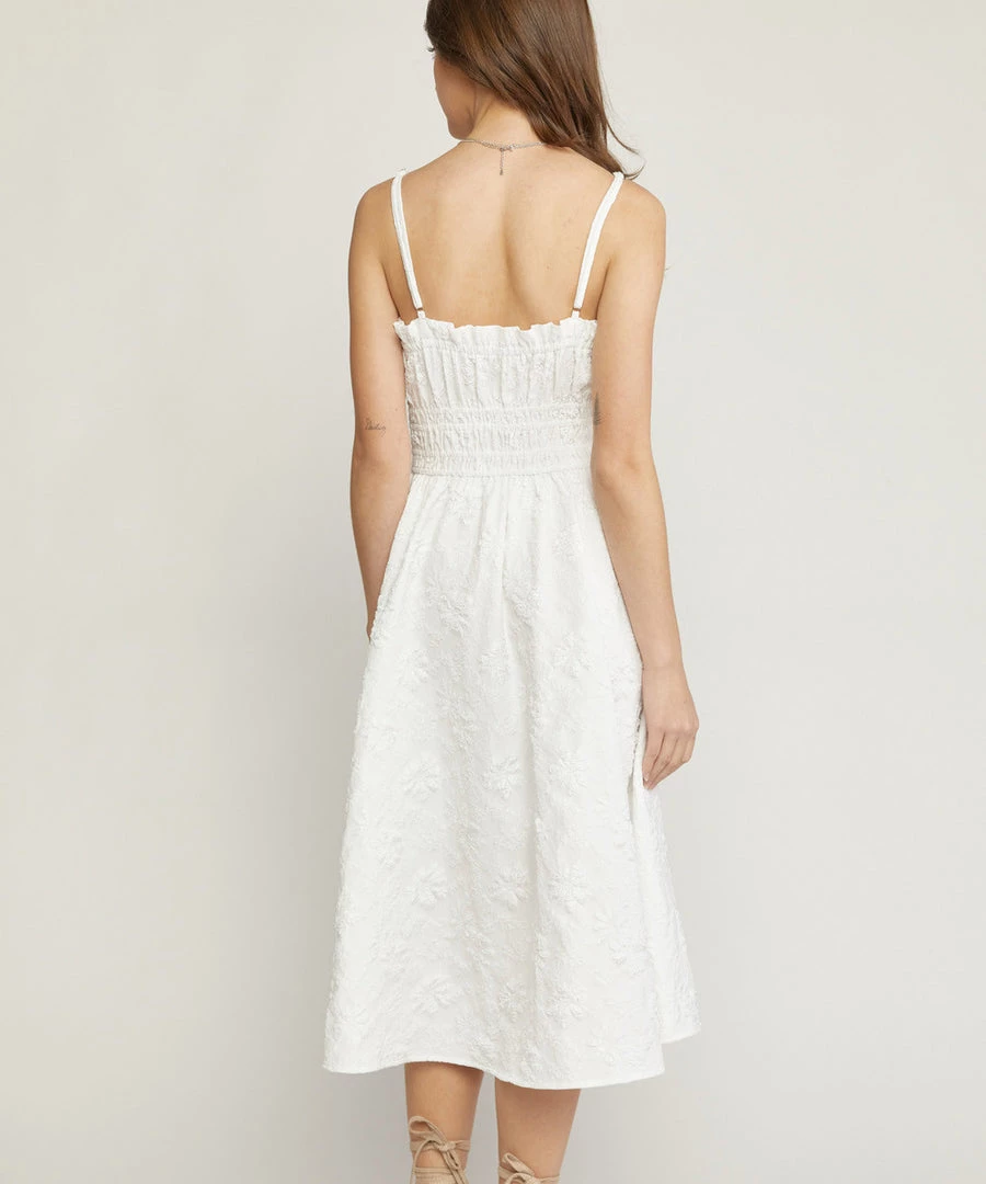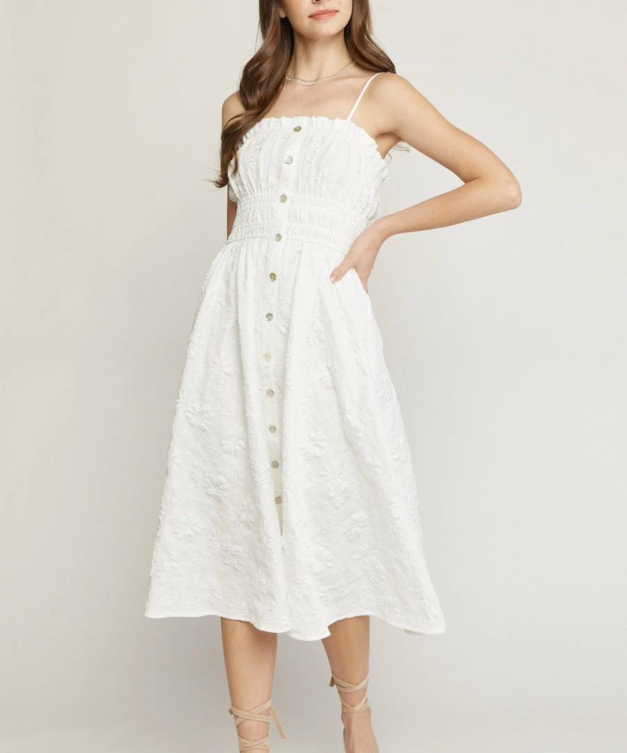 This gorgeous white dress features a tonal floral print, spaghetti straps, a square neckline and a button-down front. Complete with a smocked waist and a ruffled neckline, this dress is a must for summer days and special occasions.