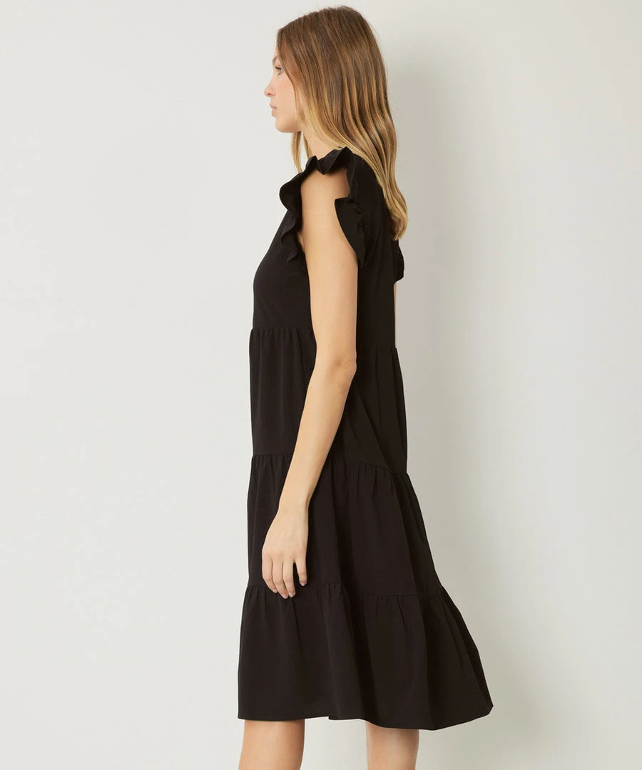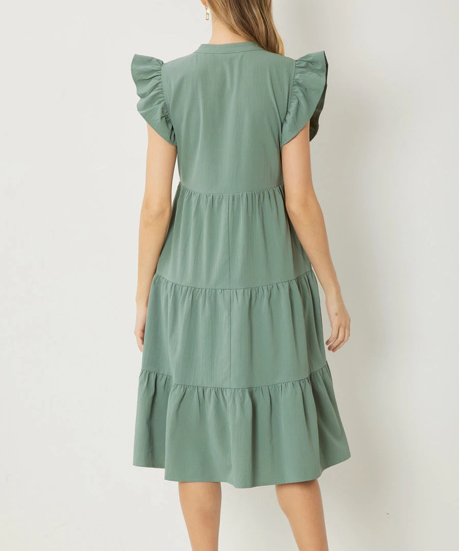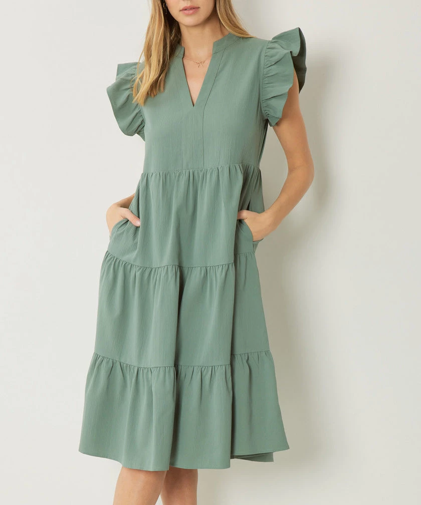 This classic v-neck midi dress features a tiered body and wide ruffle sleeves. A best selling silhouette that can be dressed up or down. Comfy and so chic!