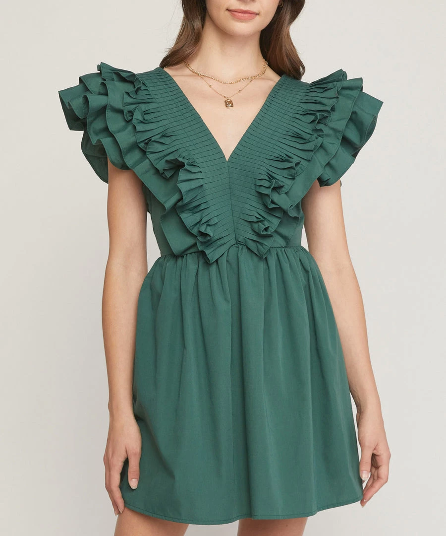 This v-neck dress features pleats and ruffle detail at the neckline and sleeves. On trend and so chic, this dress is perfect to wear now with sandals or heels and later with booties.