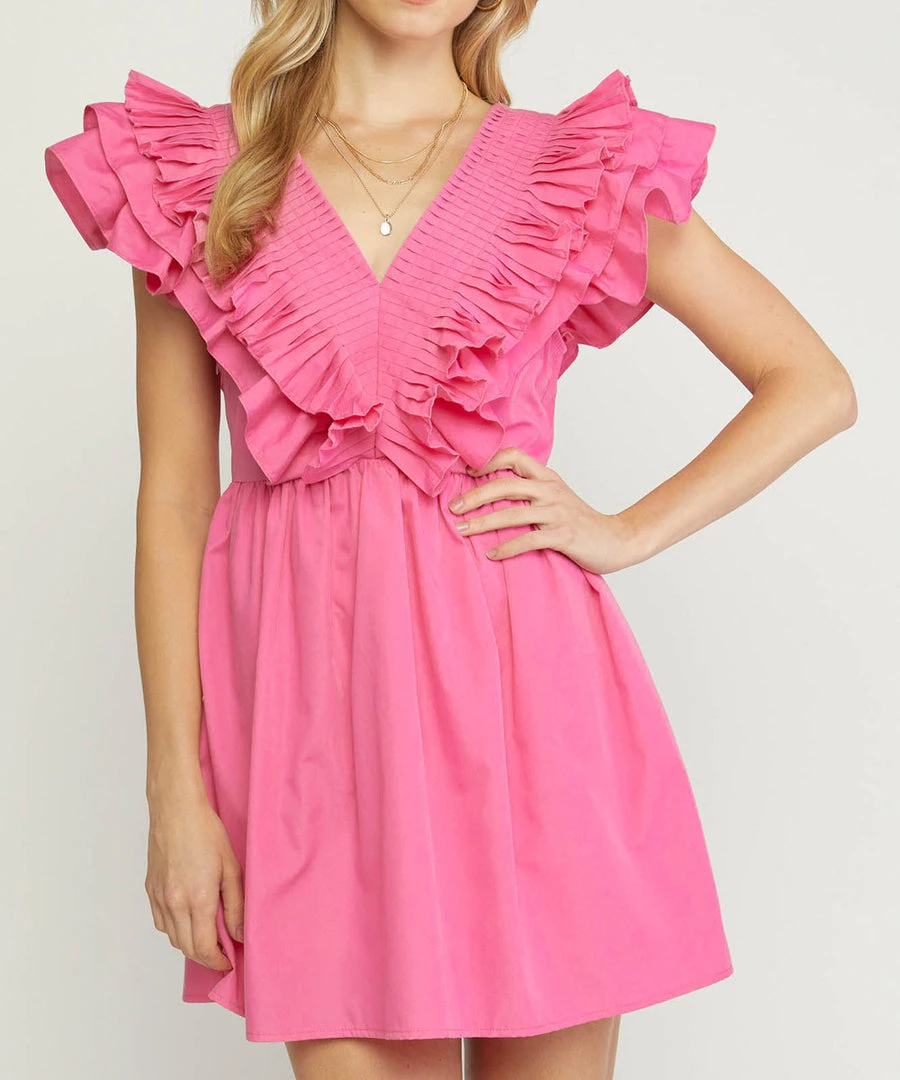 This v-neck dress features pleats and ruffle detail at the neckline and sleeves. On trend and so chic, this pink shade is summer perfection.