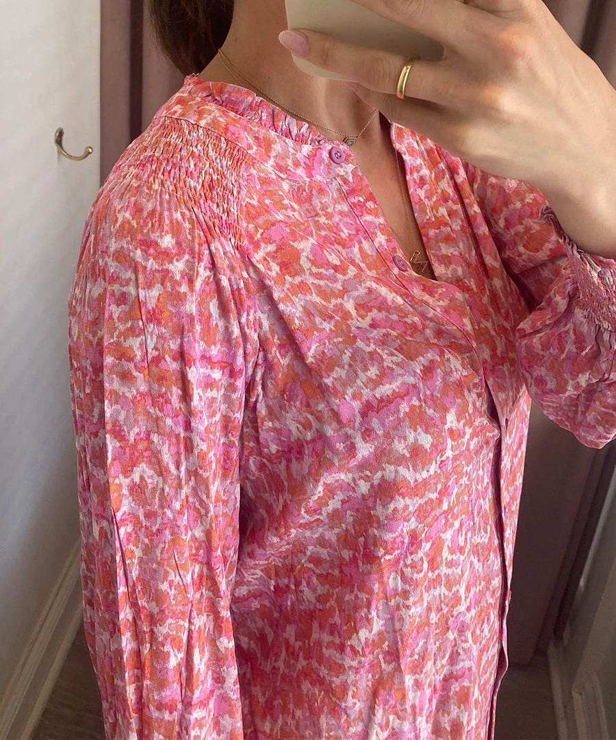 This pretty water color print blouse features a v-neckline, long sleeves and smocking detail on the shoulder. A must for work or play, this top is the perfect pop of color for the season.