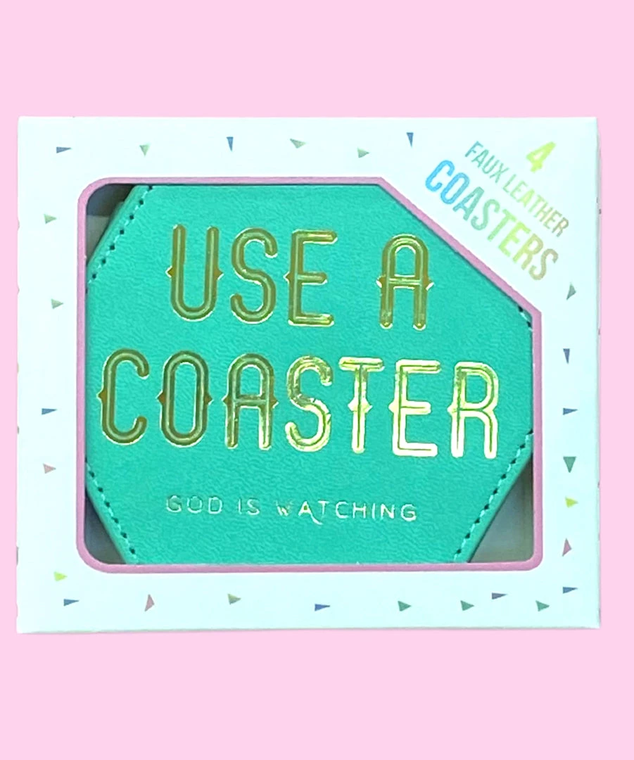 The cutest teal faux leather coasters with gold foil. Set of 4 coasters (same color and saying) in adorable packaging.