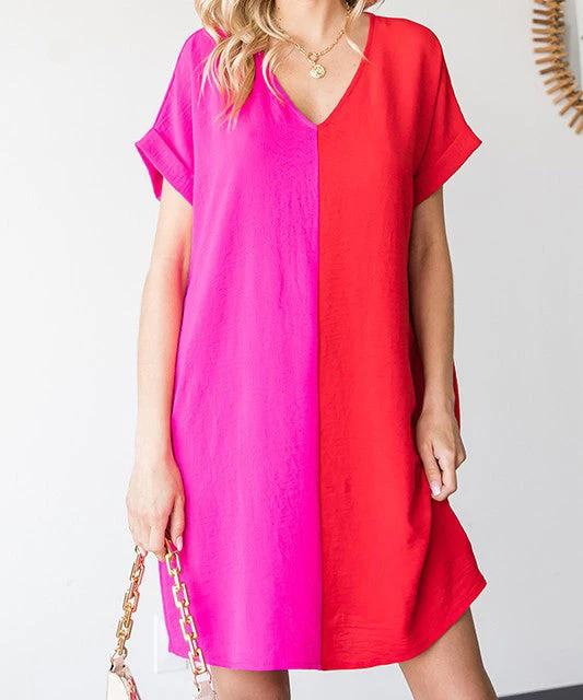 This color block shift dress features a v-neckline and roll-up short sleeves. This bold color combination is the must have look of the season. Easy to style and comfy to wear!