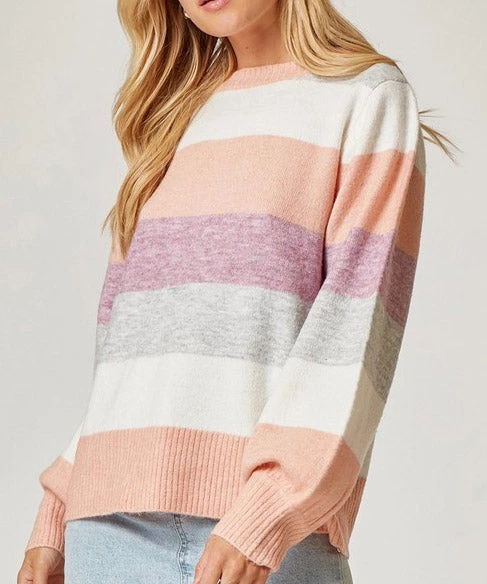 This lightweight sweater features the perfect color block mix of colors, long sleeves and a round neckline. A must for casual days. So cute!